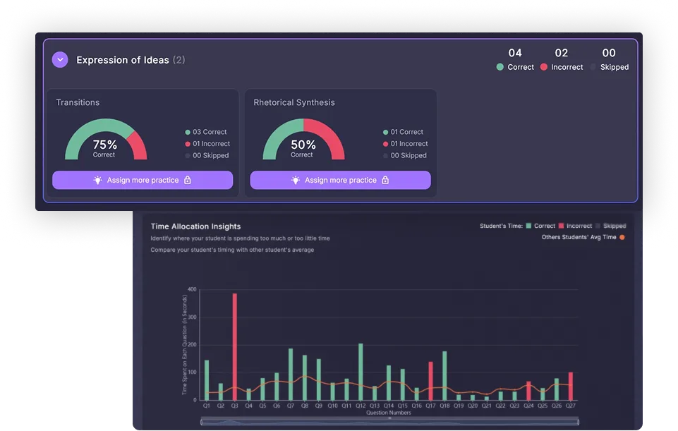 Run self-prep or instructor-led sessions with diagnostics, targeted homework, autograding, skill tracking, and parent-ready reports.